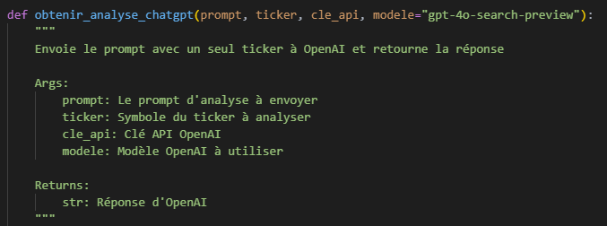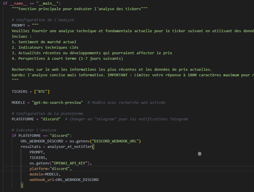 C’est ici que vous pouvez personnaliser le prompt selon vos besoins : ajouter les tickers à analyser, choisir le modèle ChatGPT à utiliser, et préciser la source des données ainsi que la timeframe; deux éléments importants pour améliorer la précision, notamment sur les indicateurs.