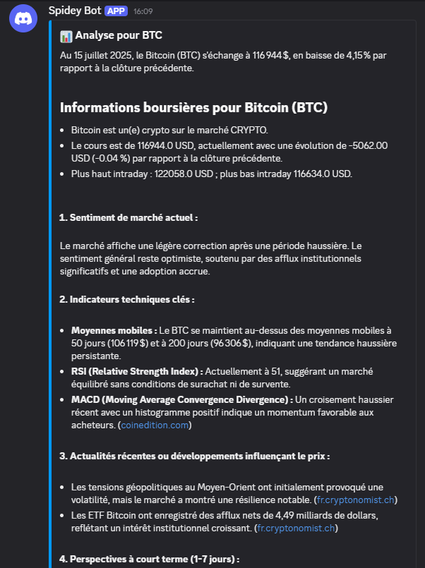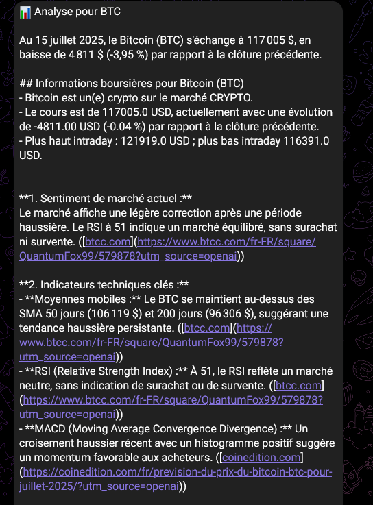 Ainsi, chaque matin à 9h, GPT analysera vos marchés préférés et publiera l’analyse dans Discord ou Telegram.