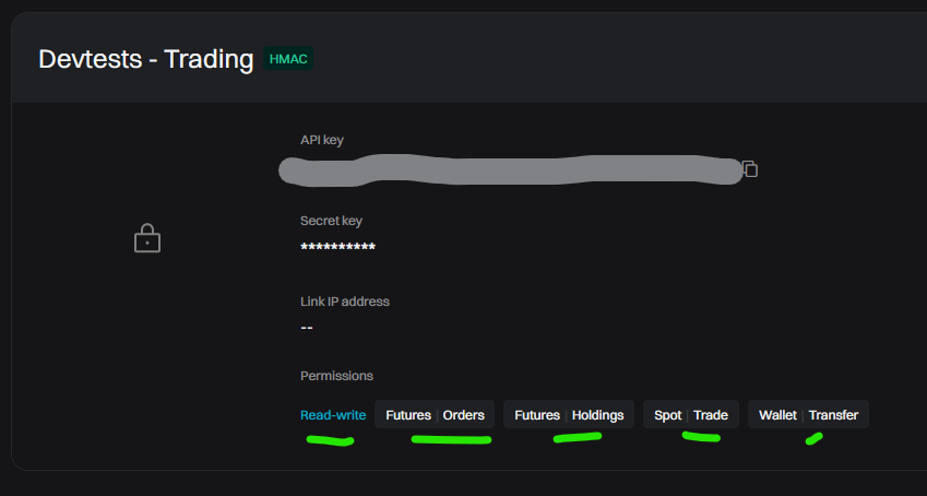 - En plus des droits précédents, activez Wallet Transfer et Trading Futures.