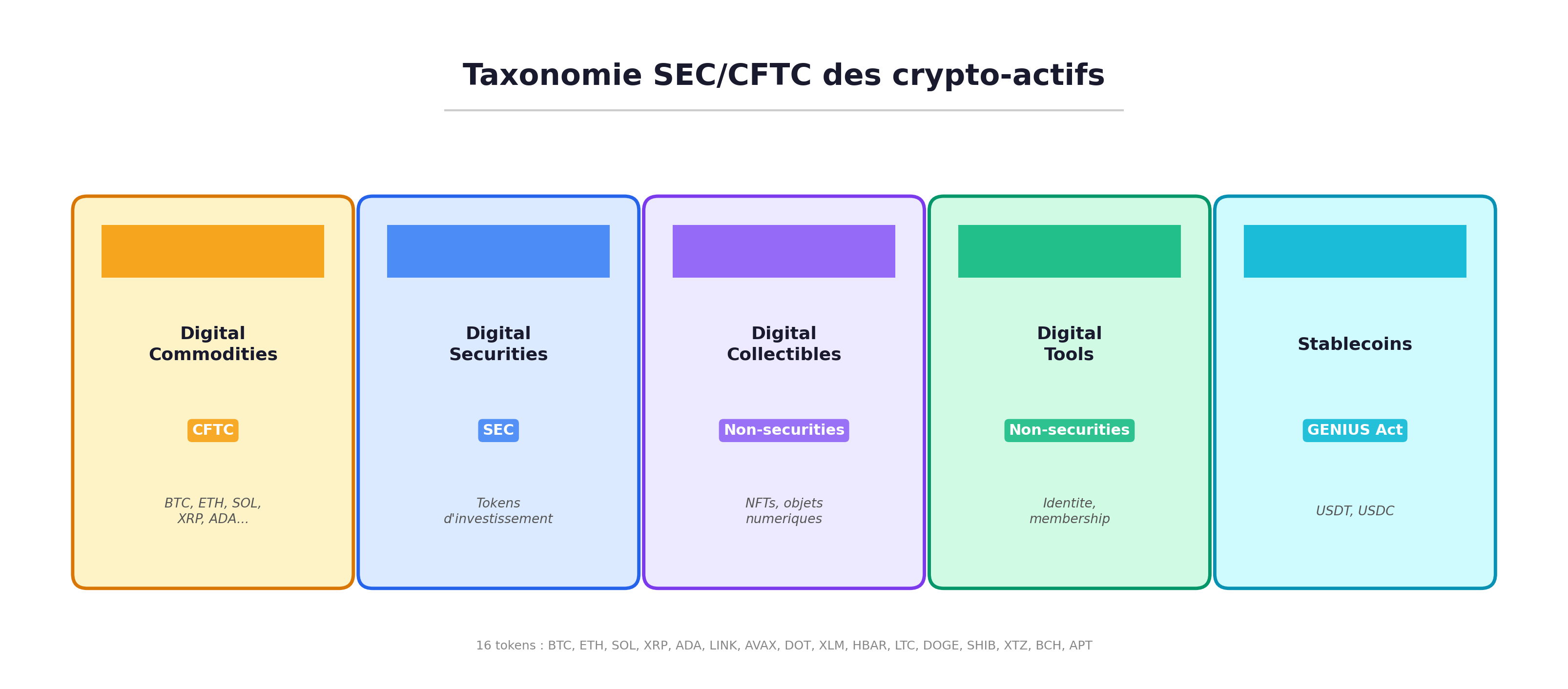 L'interprétation conjointe tranche en introduisant une taxonomie officielle en cinq catégories. Les digital commodities sont régulées par la CFTC. Les digital securities (valeurs mobilières numériques) restent sous la SEC. Les digital collectibles couvrent les NFTs et objets numériques. Les digital tools désignent les tokens à fonction utilitaire (identité, membership, accès à un service). Les stablecoins sont encadrés séparément par le GENIUS Act (Guiding and Establishing National Innovation for U.S. Stablecoins), actuellement en discussion au Congrès.
