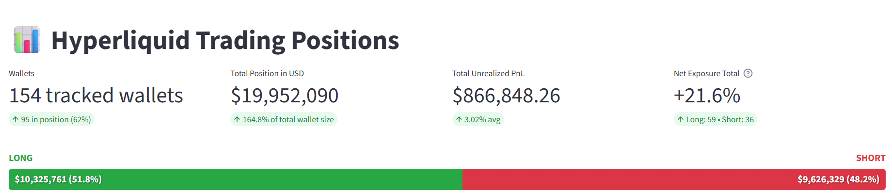 Même Les positions sont ajustées régulièrement, mais l’exposition agrégée ne change pas drastiquement. Depuis ~15 jours, on retrouve le même schéma de base : short BTC et longs sur ETH, SOL et HYPE (le token Hyperliquid).