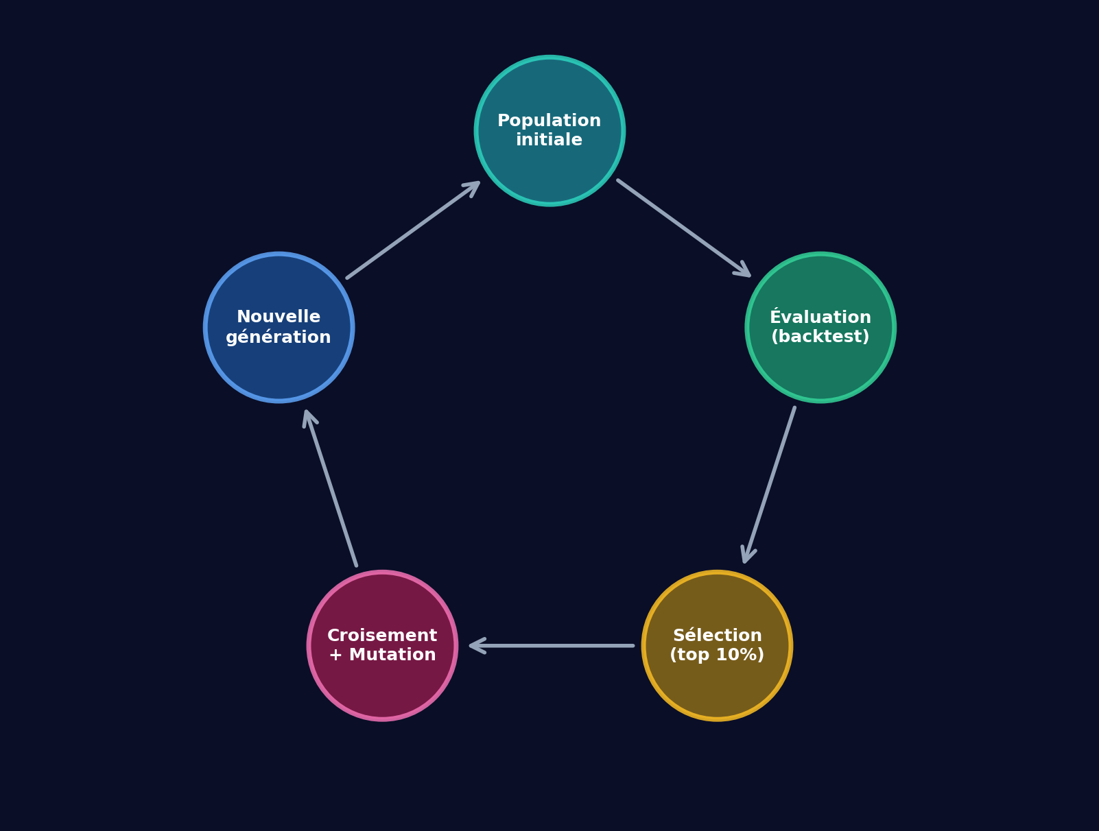 Ce cycle complet (évaluation, sélection, croisement, mutation) constitue une génération. Le processus se répète sur des dizaines de générations. À chaque itération, les formules s'affinent. Au terme de l'évolution, la formule la plus performante est le champion : elle est alors testée sur des données out-of-sample (que l'algorithme n'a jamais vues) pour vérifier si elle se généralise. Avec des populations de 15 000 formules et 20 générations, le processus représente 300 000 backtests, ce qui explique les jours de calcul.