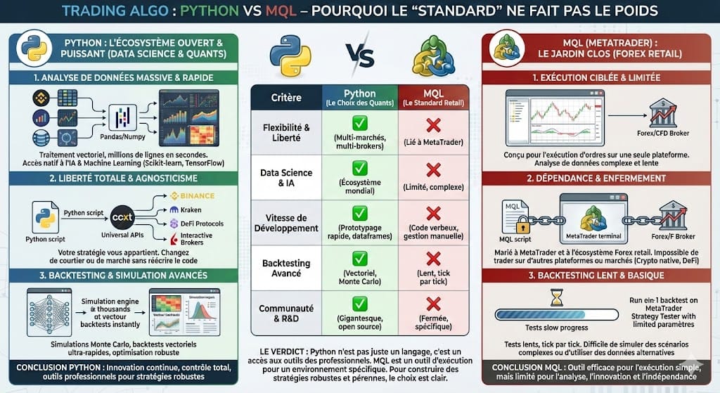 MQL est un excellent outil pour débuter le trading manuel assisté ou les petits automates sur le Forex. Mais pour construire des systèmes robustes, basés sur les probabilités (comme notre Risk of Ruin évoqué dans une précédente newsletter) et capables d'évoluer avec le marché, Python est le seul choix sérieux.
