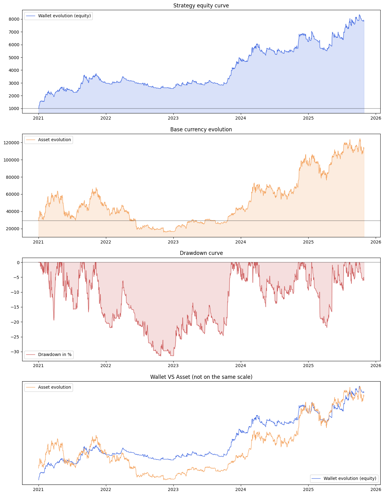 Entre 2021 et fin octobre 2025, voici les performances de cette stratégie en backtest :